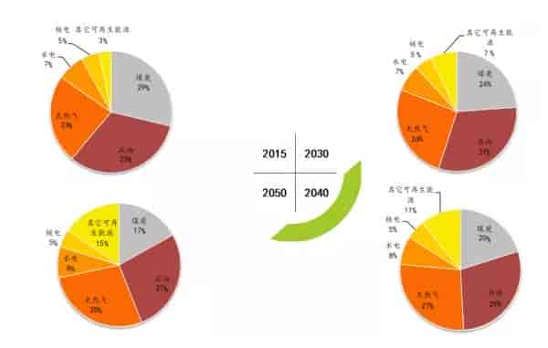 與之相對應(yīng)的是,人們在終端用能的方面也會更側(cè)重清潔能源,煤炭和石油在能源消費終端的占比都會下降。到2050年,煤炭占比快速下滑至8%左右,石油占比從2015年的45%降至38%,天然氣和電力占比較快提升。到2050年,天然氣和電力占比將分別達22%和28%。