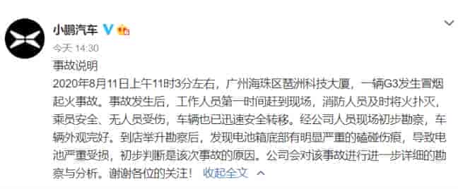 8月11日小鵬G3廣州起火,小鵬回應因電池嚴重受損