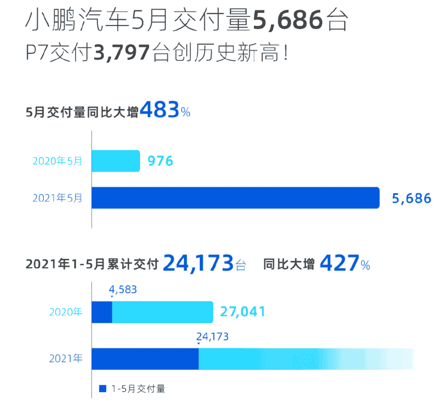 小鵬汽車5月交付5686輛新車,同比增長483%,環(huán)比增長10.47%。其中,小鵬P7交付量一路走高,達(dá)到3797輛,創(chuàng)下自去年7月以來的最高月交付紀(jì)錄,G3交付1889輛。截至2021年5月底,小鵬汽車本年度累計交付量達(dá)到24173輛。