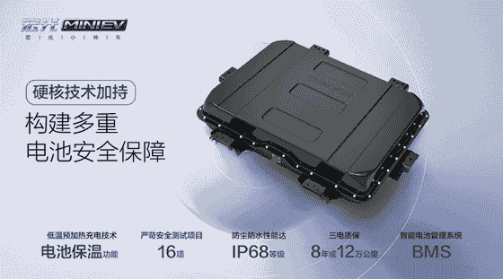 1、硬核技術保障, 冬季續航不妥協——宏光MINI EV搭載低溫預加熱充電技術及電池保溫功能,可以在低溫充電狀態下對電池預先啟動升溫并讓電池包溫度保持在15-20℃,在充電情況下能持續保溫長達 24 小時,動力性能相較其他無保溫車型提升 50%,整體續航里程提升 10%,讓電池時刻保持高效的工作狀態,有效解決冬季續航打折的問題。