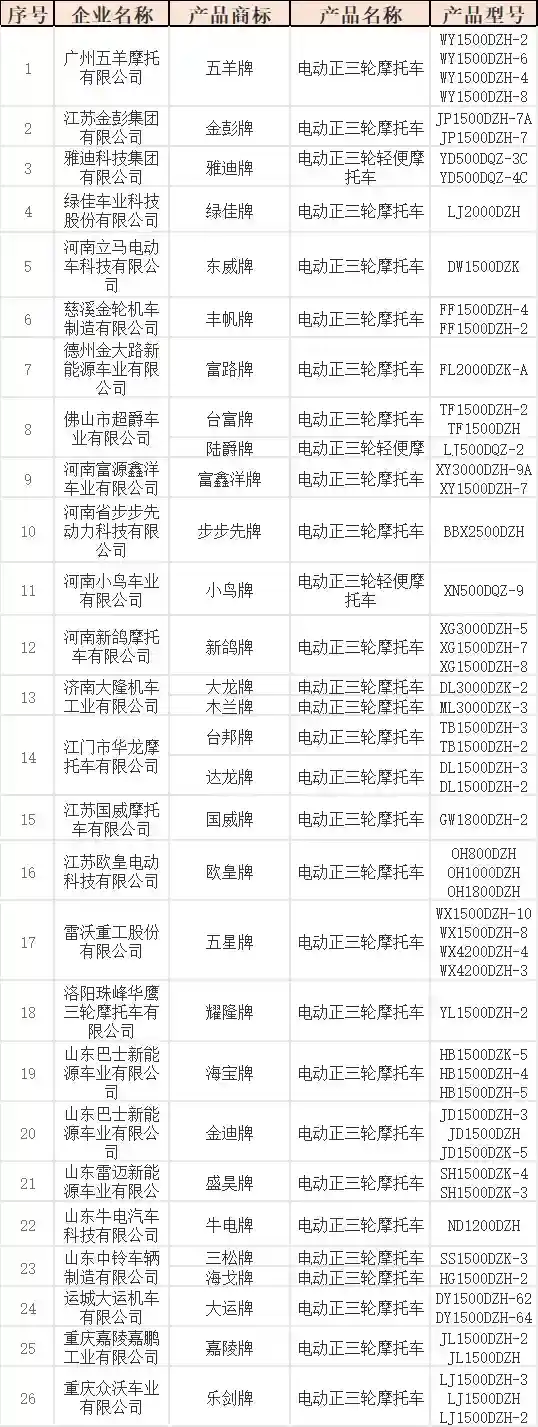 工業和信息化部近日公示了第323批《道路機動車輛生產企業及產品公告》,其中在三輪車方面,有26家企業的56款電動三輪車、19家企業的30款燃油三輪車入選,五羊、金彭、江蘇宗申、雅迪、綠佳、立馬等企業多款產品入圍。